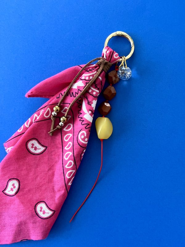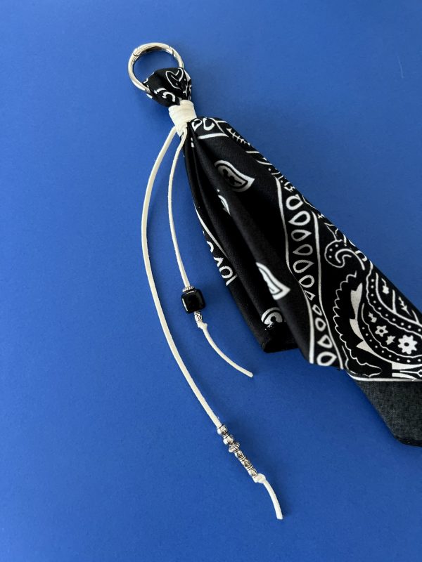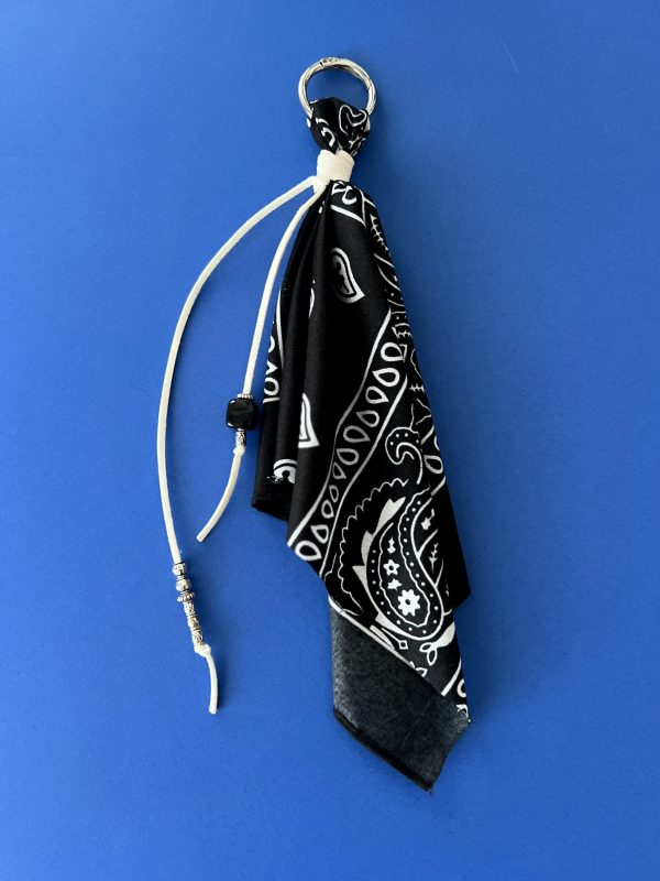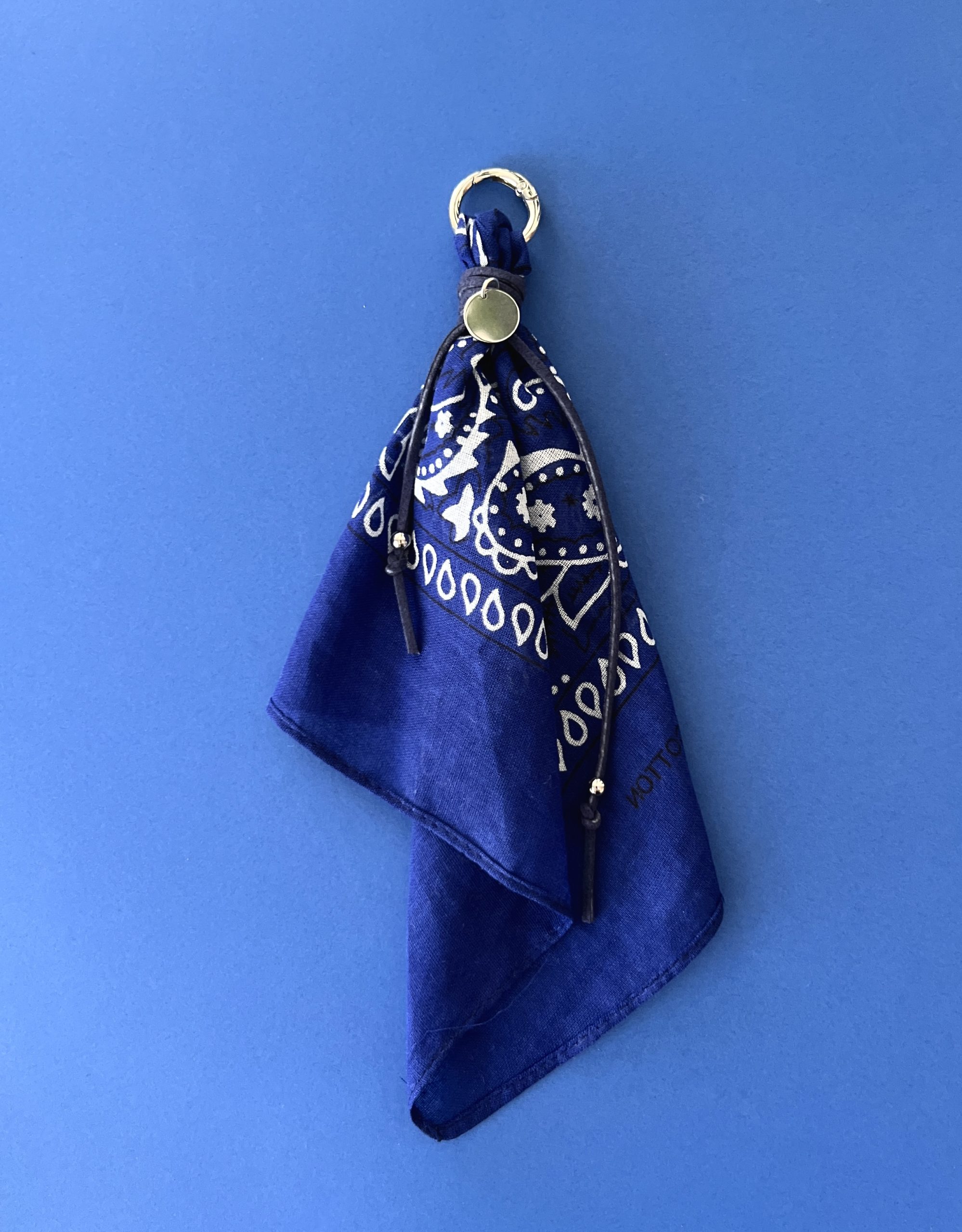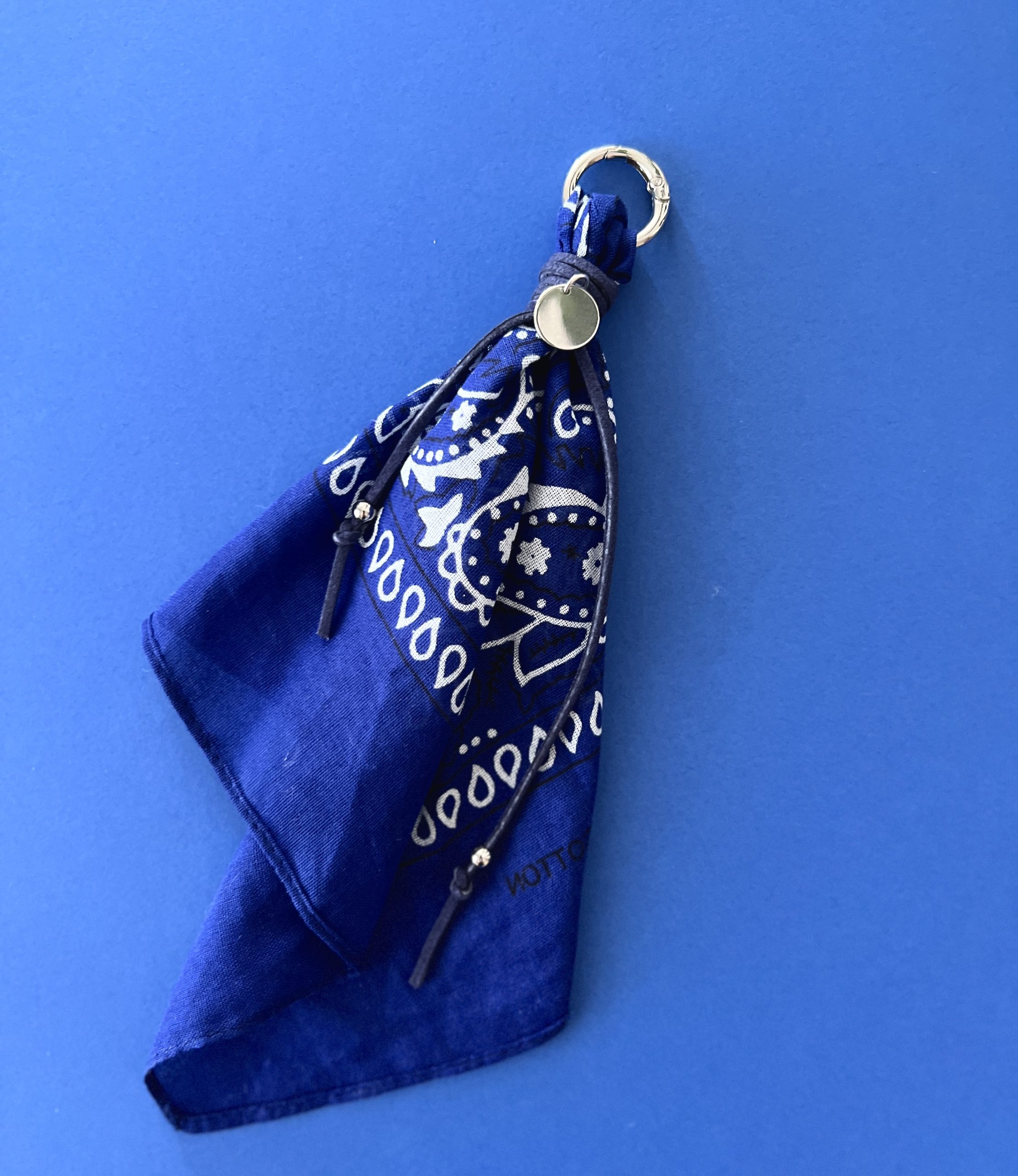 - Υλικά: μπλε μπαντάνα, μπλέ σουέντ κορδόνι, ασημένια στοιχεία
