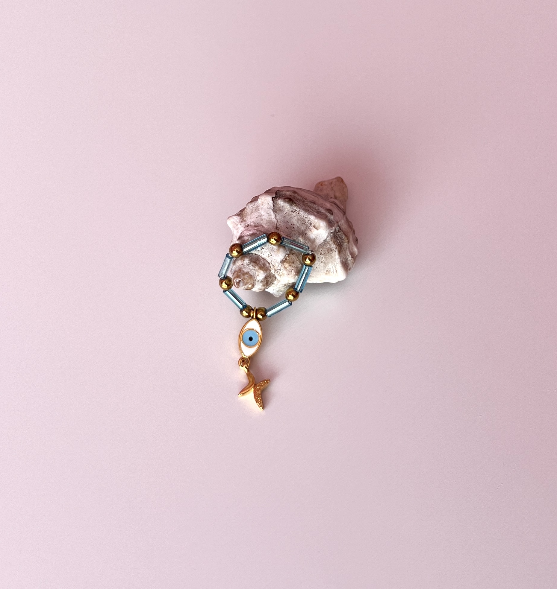 - Υλικό: ελαστικό κορδόνι σιλικόνης, στοιχεία από επιχρυσωμένο ορείχαλκο, χάντρες ατσάλι, γυάλινες χάντρες