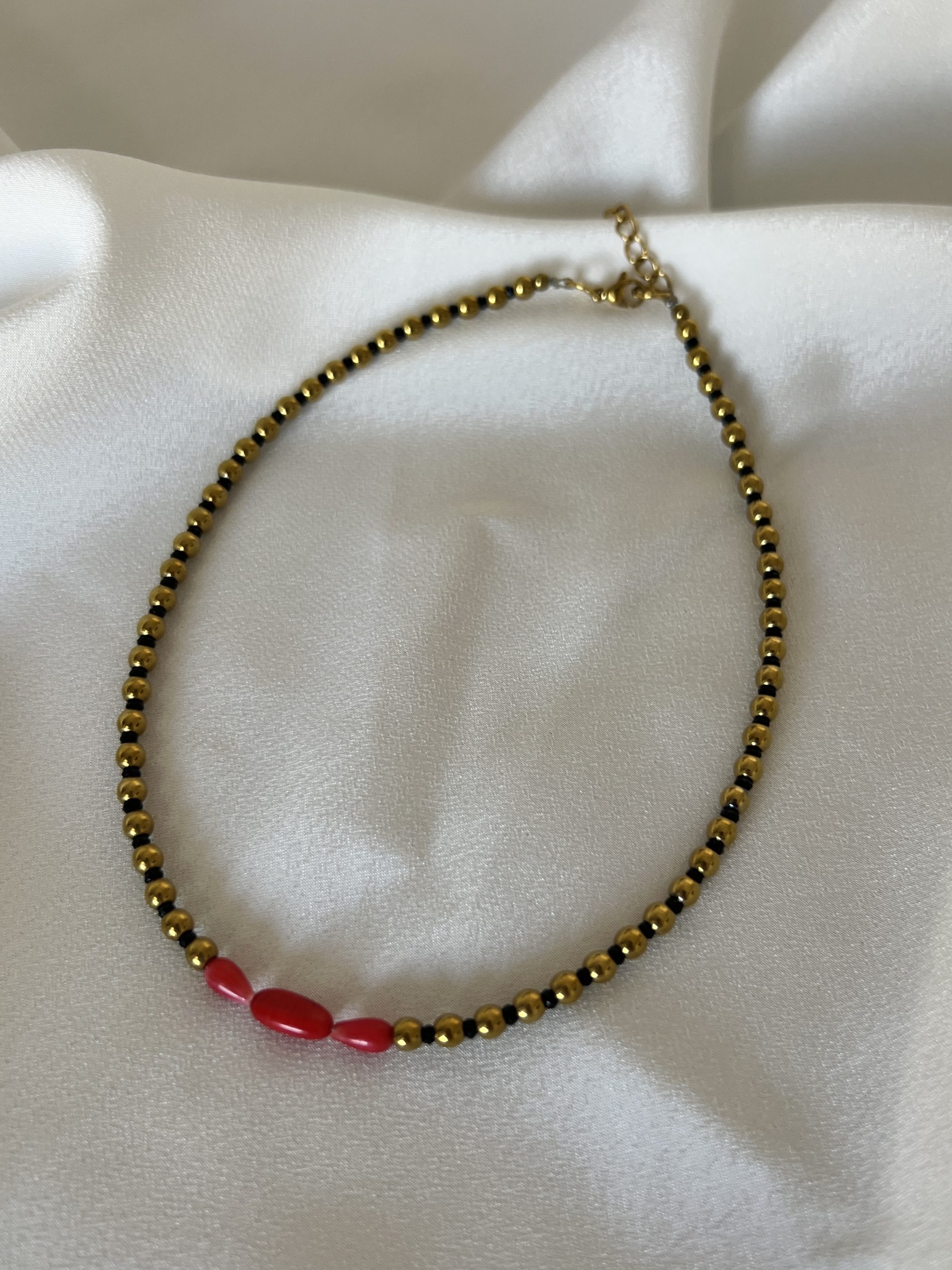 - Υλικό: φυσικές πέτρες κοράλι, χρυσές χάντρες αιματίτη, μαύρες κρυστάλλινες πέτρες