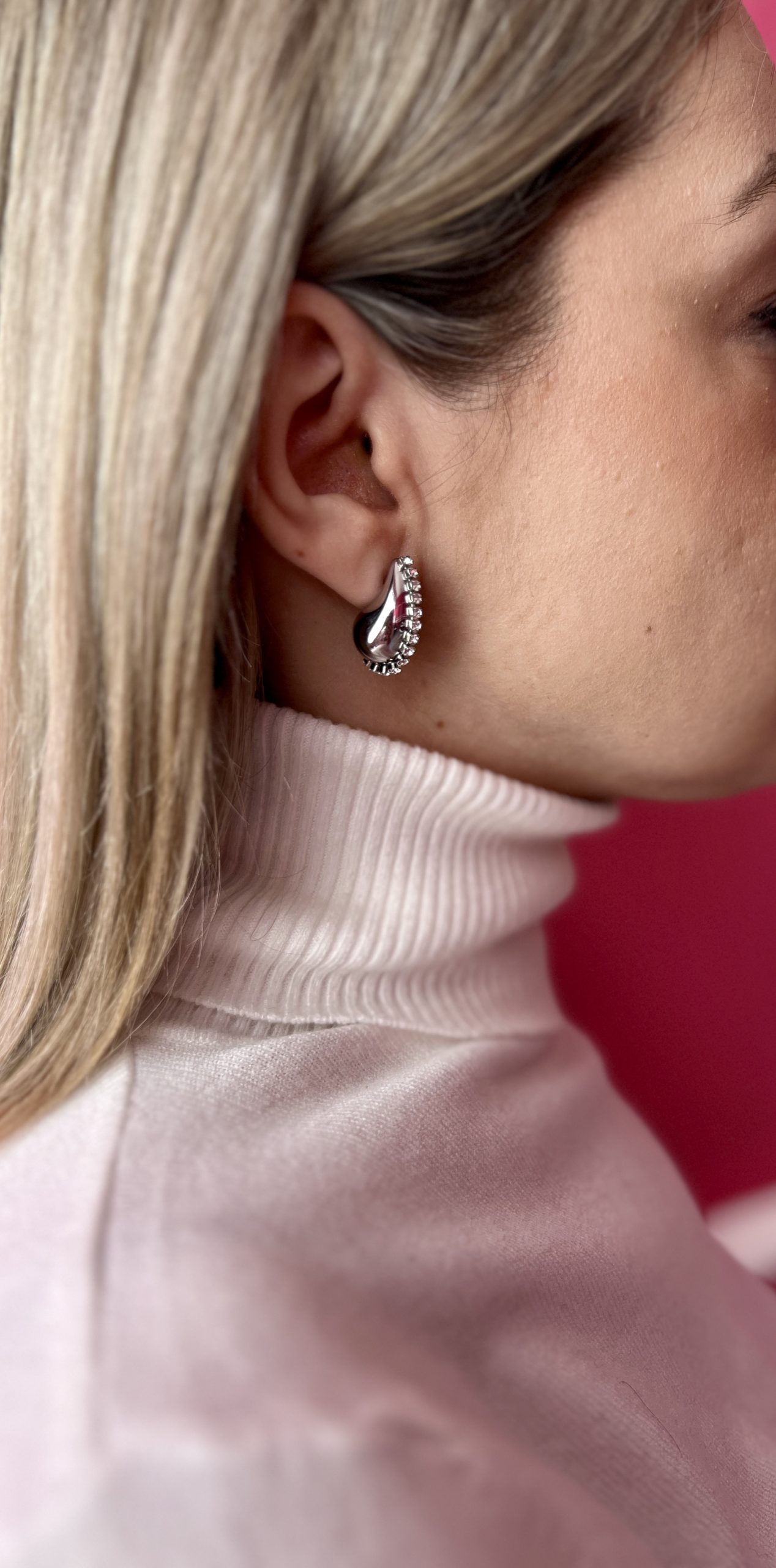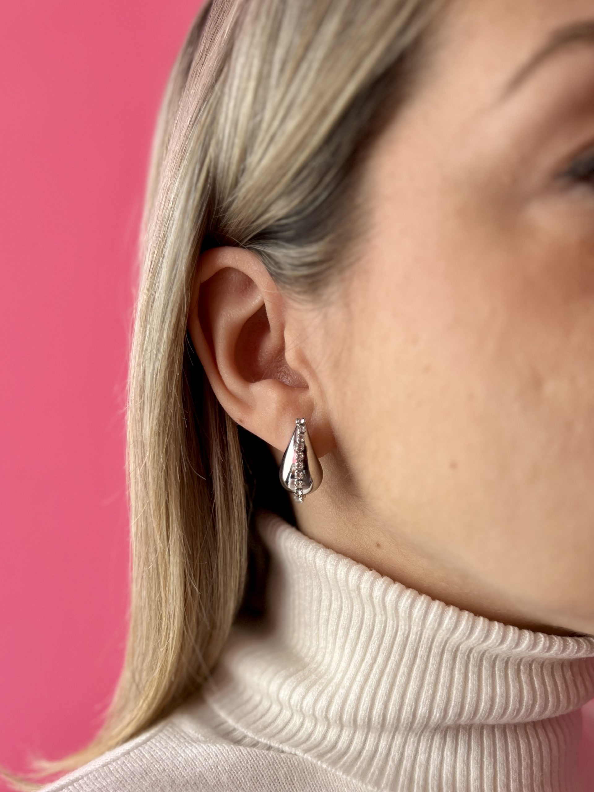• Εντυπωσιακό ασημί σκουλαρίκι με στρας, έχει μια διακριτική λάμψη στο αυτί, ιδανικό με πιασμένα μαλλιά